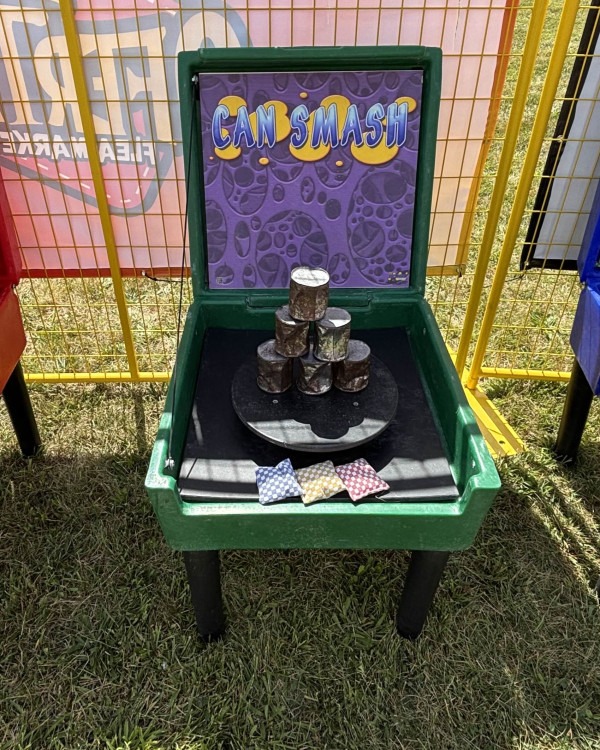 Smash down the pyramid of cans to win a prize.