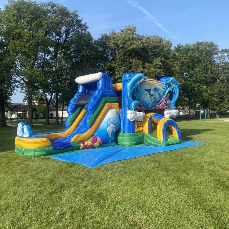 Our Dolphin Splash is a great water slide for younger participants. This inflatable includes a large jumping section with a climbing wall and then a slide down the slide. Your kids will enjoy the beautiful artwork and design of this amazing inflatable. and the dolphins. You can also use this as a dry slide if you choose. If you would like to order this as a dry combo slide, please visit the bounce and slide combo link on our website.